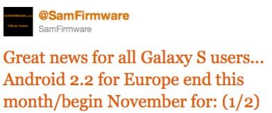 Arrivano nuove informazioni per i possessori Europei di Samsung Galaxy S. Un Tweet di SamFirmware (che non è in alcun modo riconducibile ai canali ufficiali Samsung) comunica l'arrivo dell'aggiornamento a Froyo per il top di gamma Android. Una data, fine ottobre, inizio novembre, voluta da Samsung stessa solo per i seguenti paesi: Italia, Francia, Germania, Spagna, Olanda e Belgio. Da quanto è trapelato il ritardo è causato da un problema di fluidità e rendering del Browser (colpa del Flash 10.1?). Questo significa evidentemente che Samsung tiene a fare bella figura nei mercati selezionati, reputati quindi i più importanti